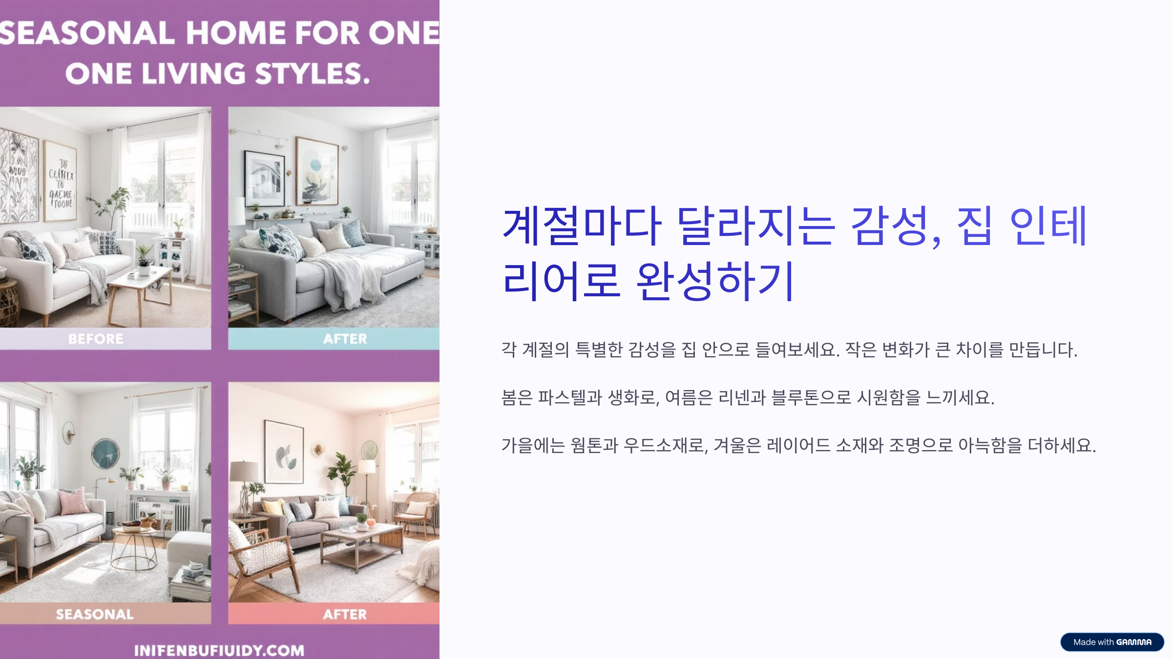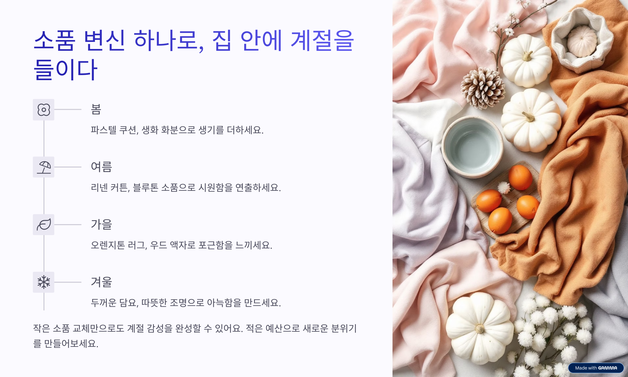 계절에 따라 인테리어를 바꾸는 것은 단순한 꾸미기를 넘어서 삶의 리듬과 감성을 살리는 방법입니다.