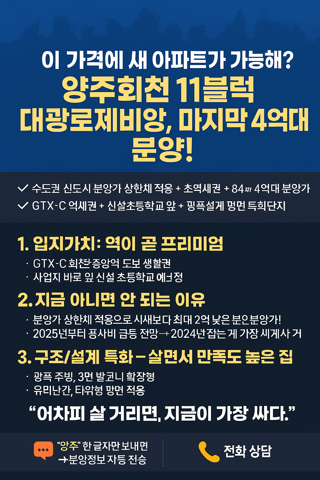 “서울과의 거리를 좁히는 GTX-C 노선, 그리고 그 중심에 선 회천 대광로제비앙. 4억대 분양가로 미래를 선점할 수 있는 기회가 눈앞에 펼쳐집니다.”